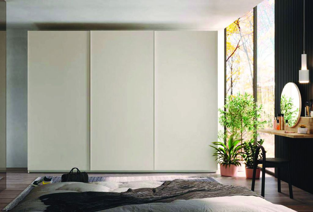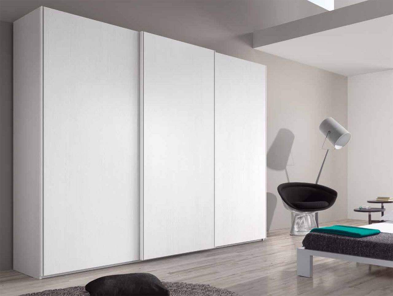 Armario de tres puertas correderas con guías tren y sistema retenedor, fabricadas en laca blanca satinada. Las puertas van marcadas con una ralla en medio donde se ha empotrado el tirador uñero cuadrado de tamaño inferior.