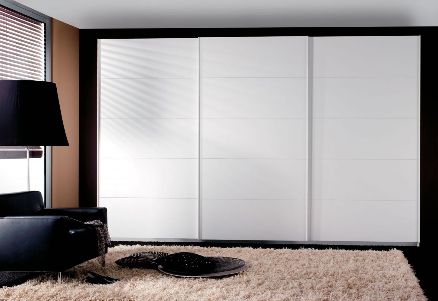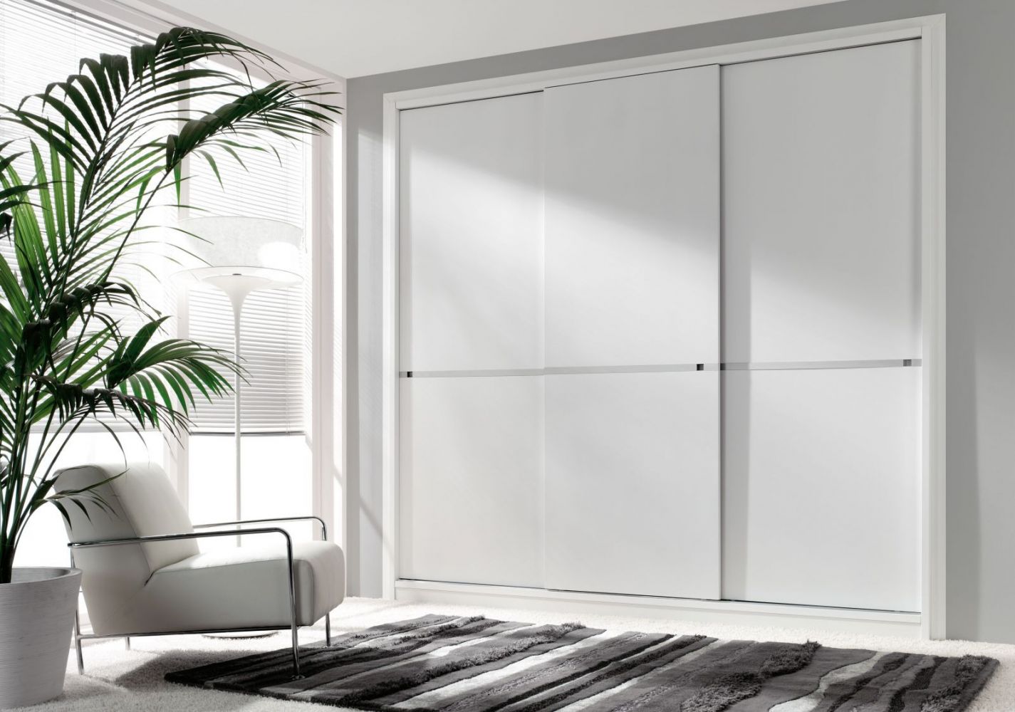 Armario de tres puertas correderas con guías ocultes y sistema de freno, fabricado en laca blanca satinada con cuatro rallas marcadas horizontalmente y los tiradores verticales de aluminio lacados del mismo color.