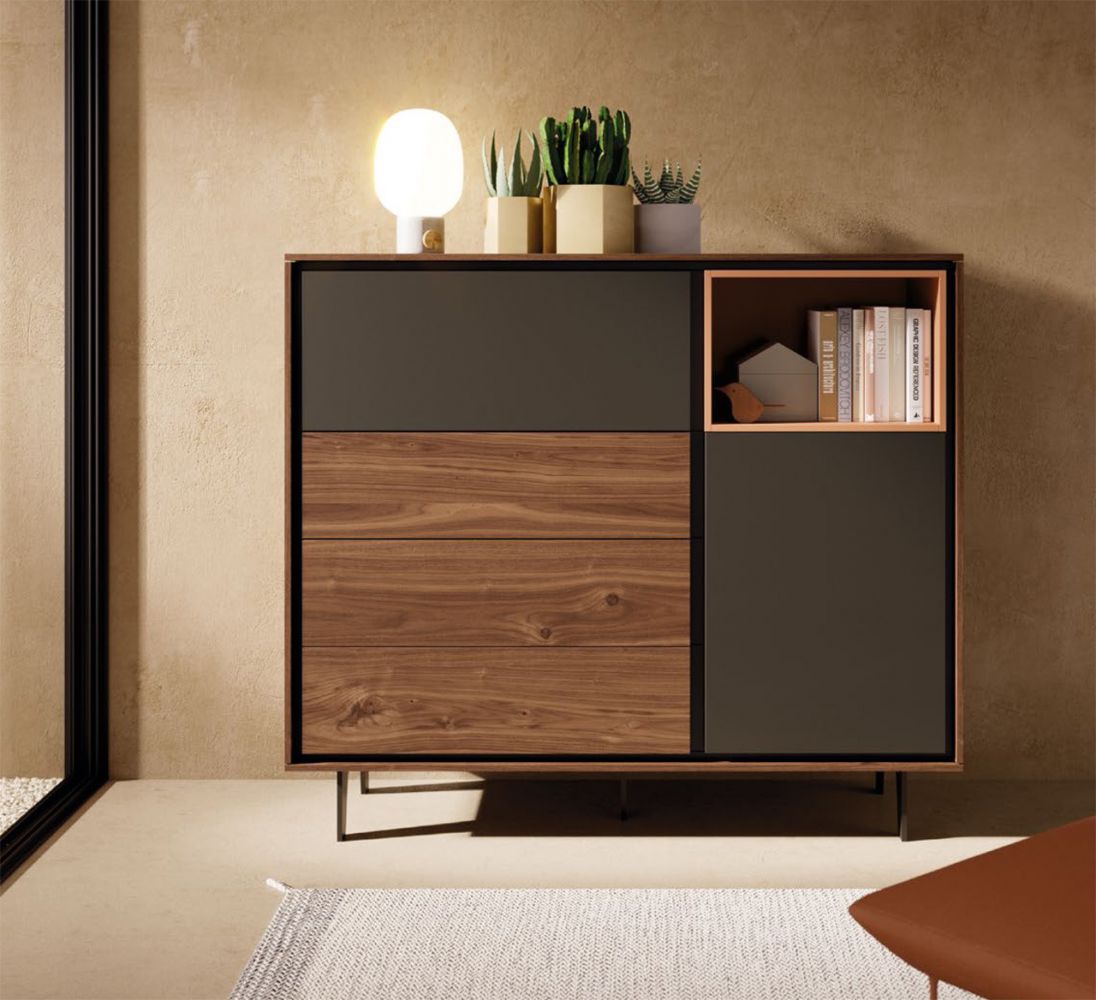 Acabados: Nogal nudoso, marengo mate, duna mate.