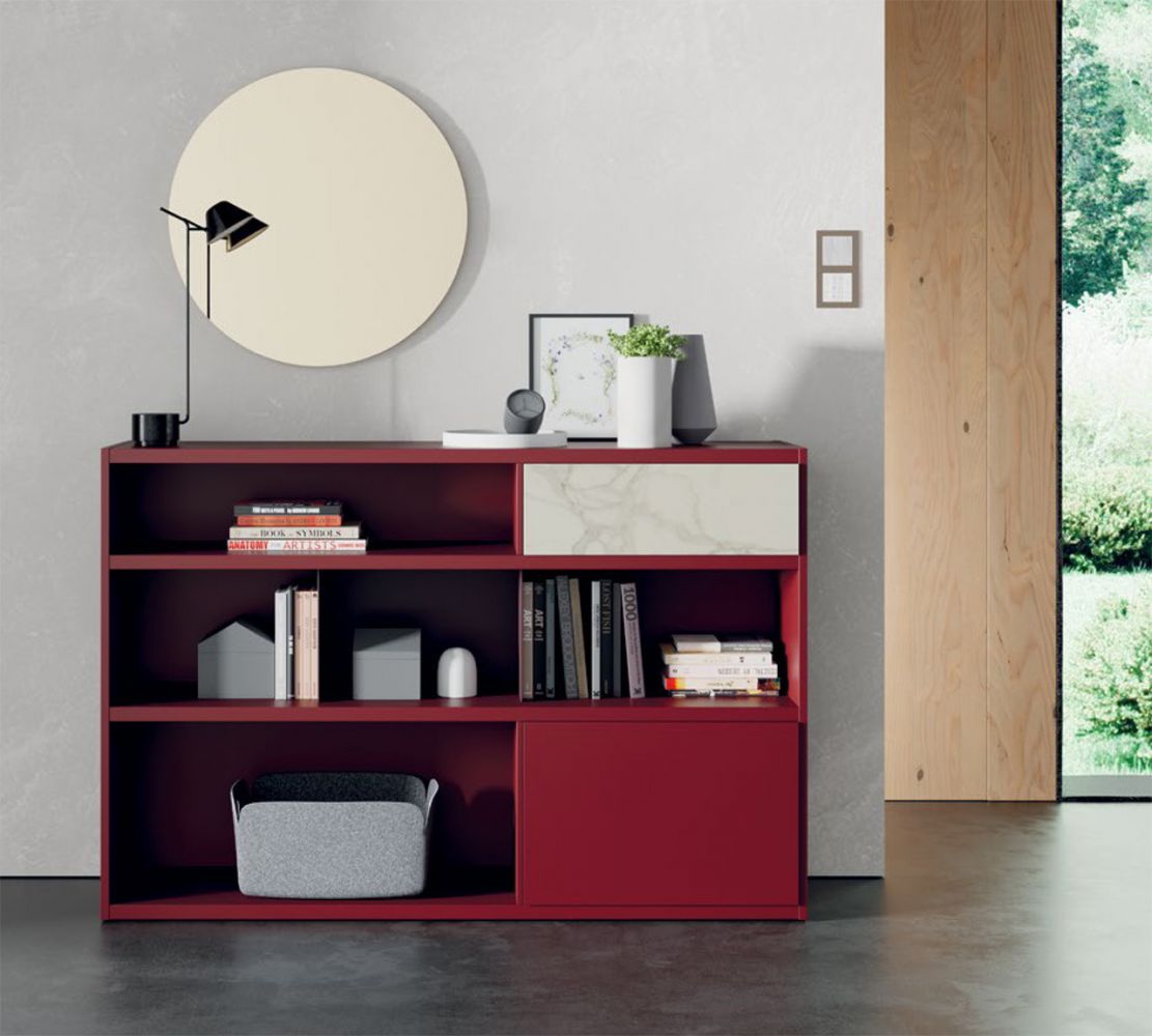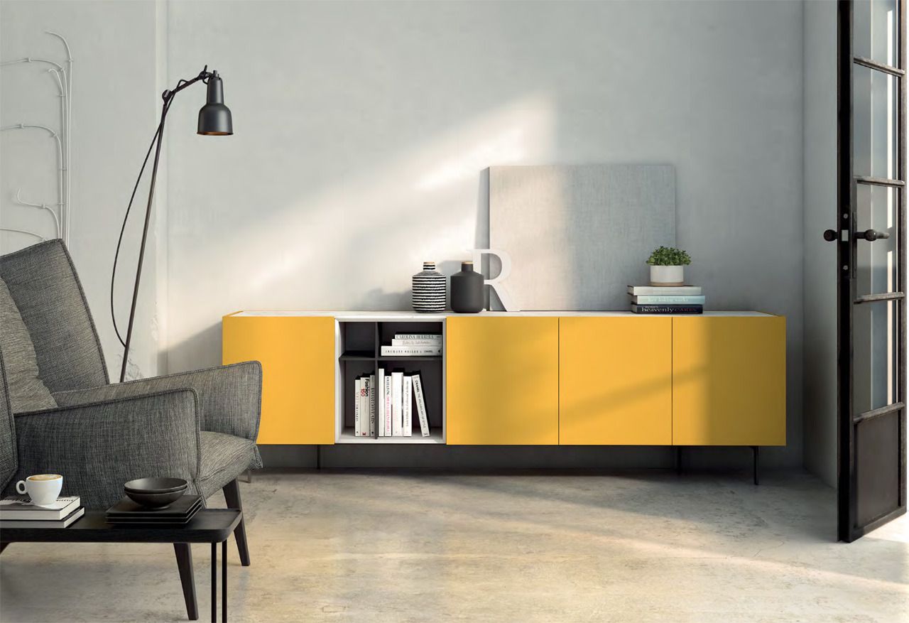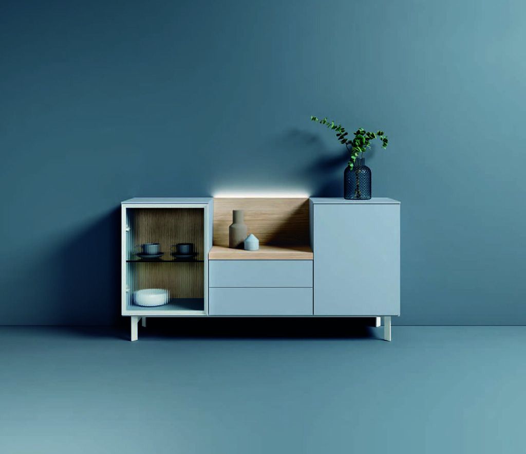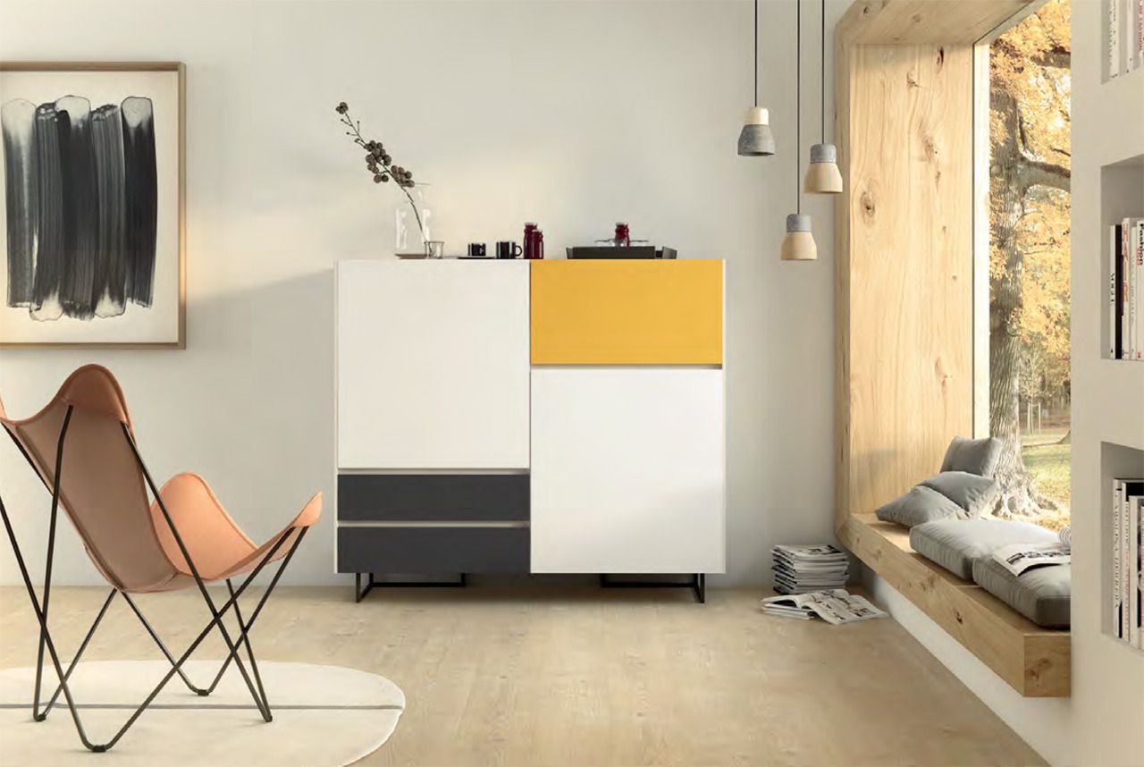 Un salón moderno con piezas simples y elegantes. Este bufet es una pieza totalmente vertical con un toque impresionante de color.