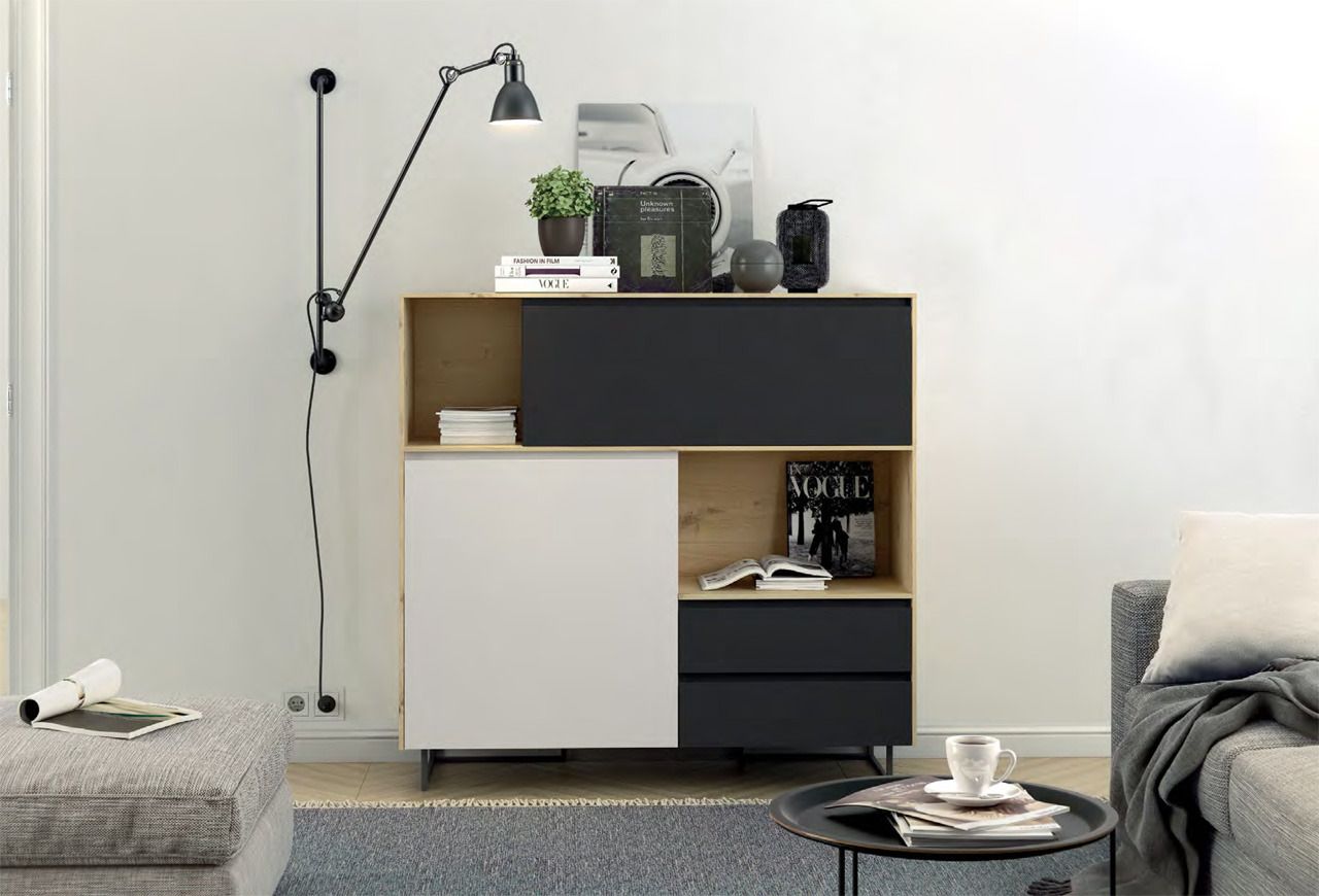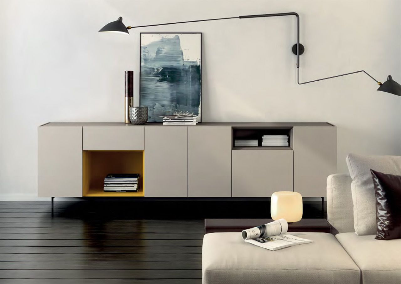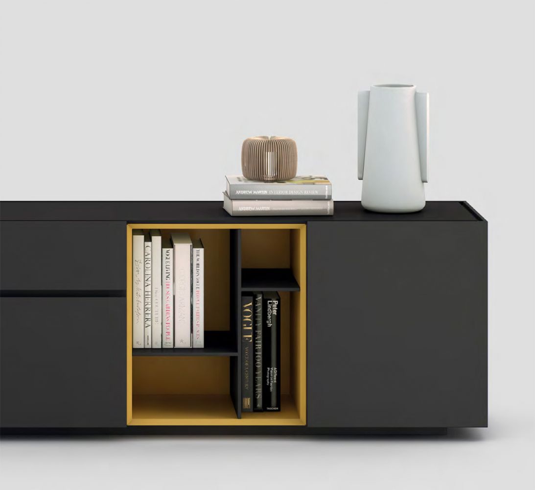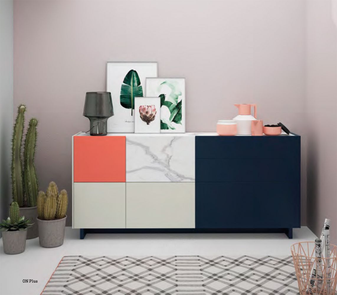 Un salón moderno con piezas simples y elegantes. Este bufet es una pieza totalmente vertical con un toque impresionante de color.