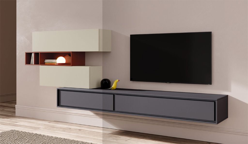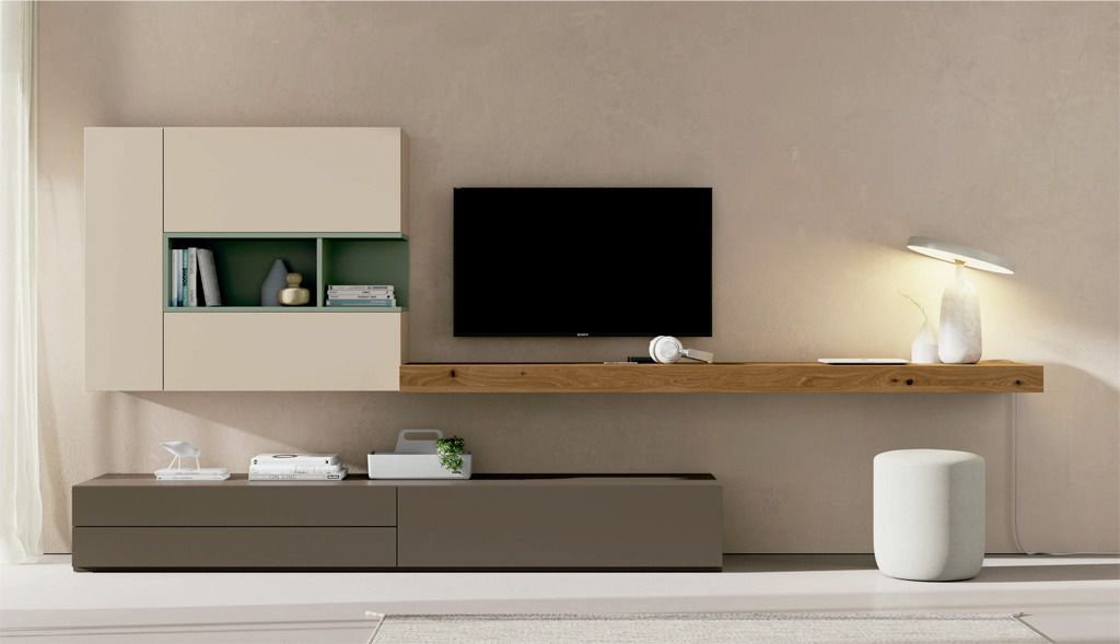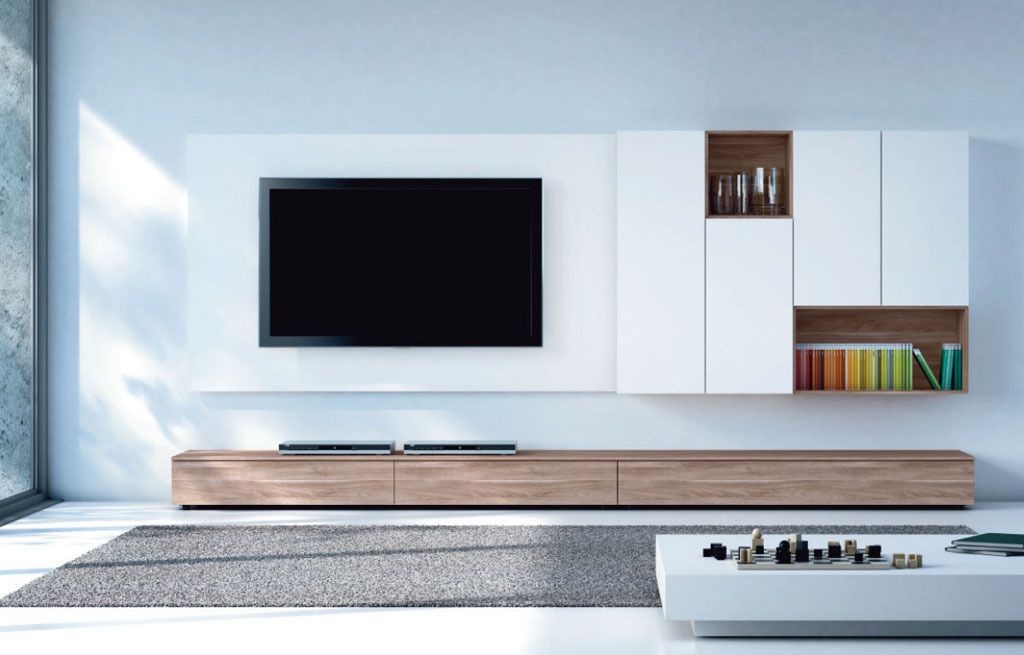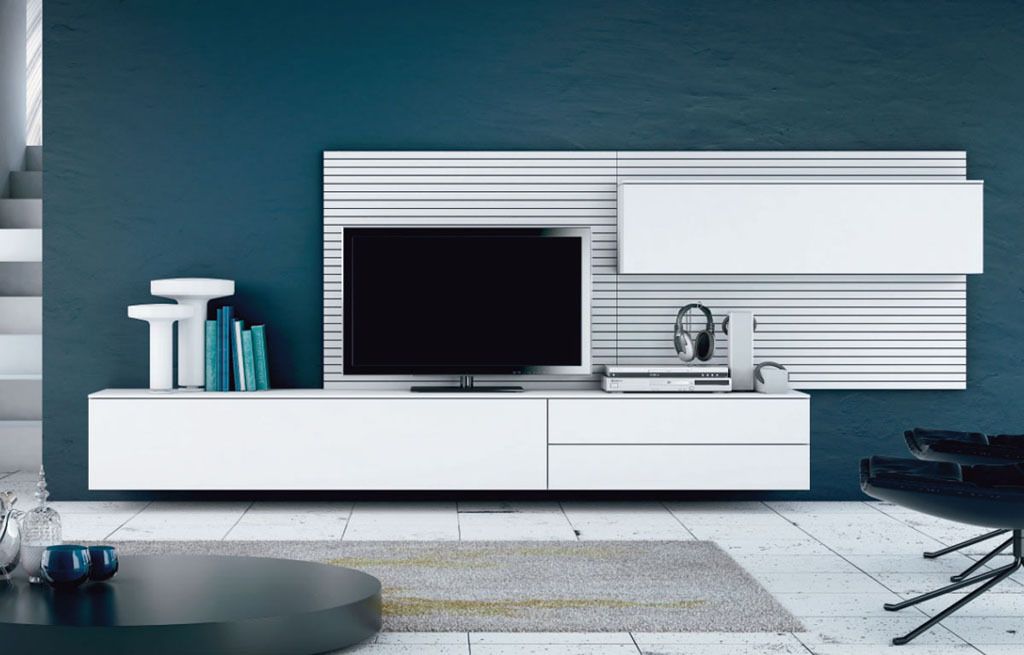 Una composición geométrica luminosa y equilibrada que integra una ingeniosa solución para el sistema de cableado de la televisión