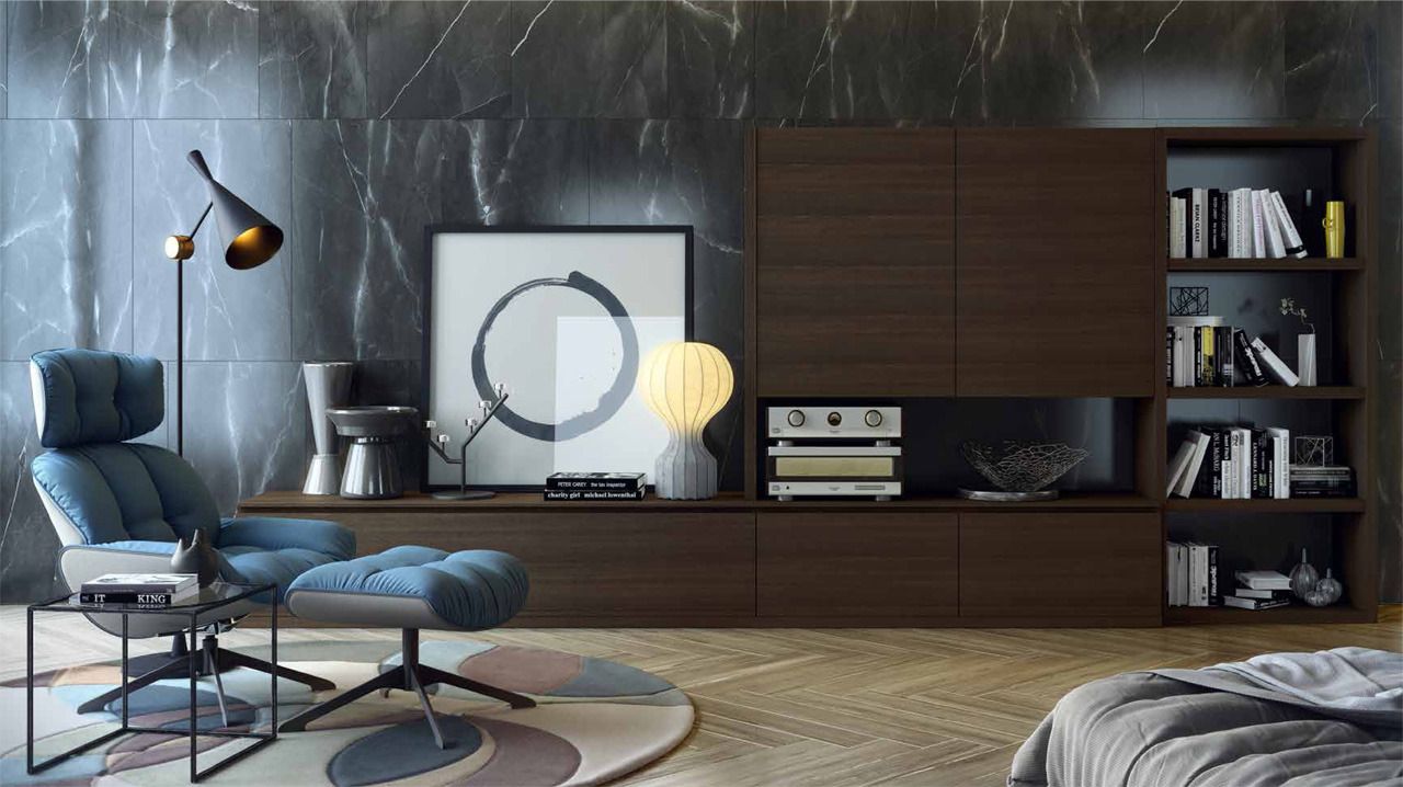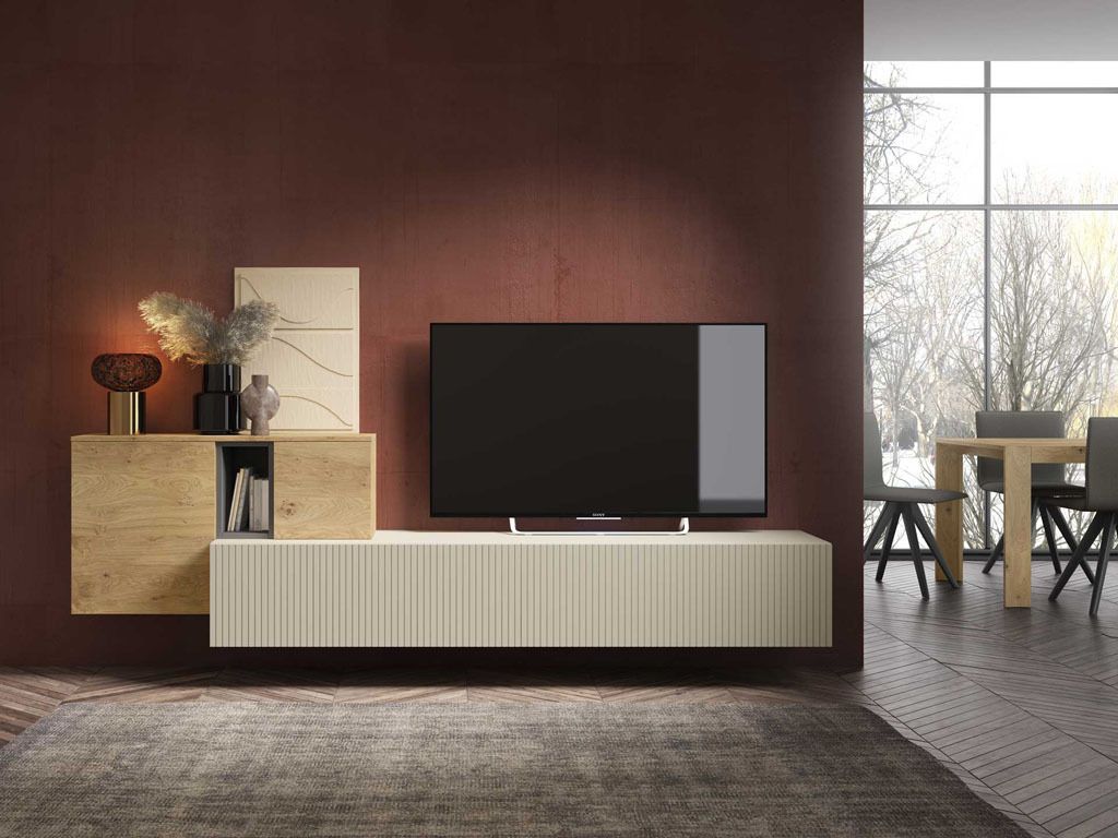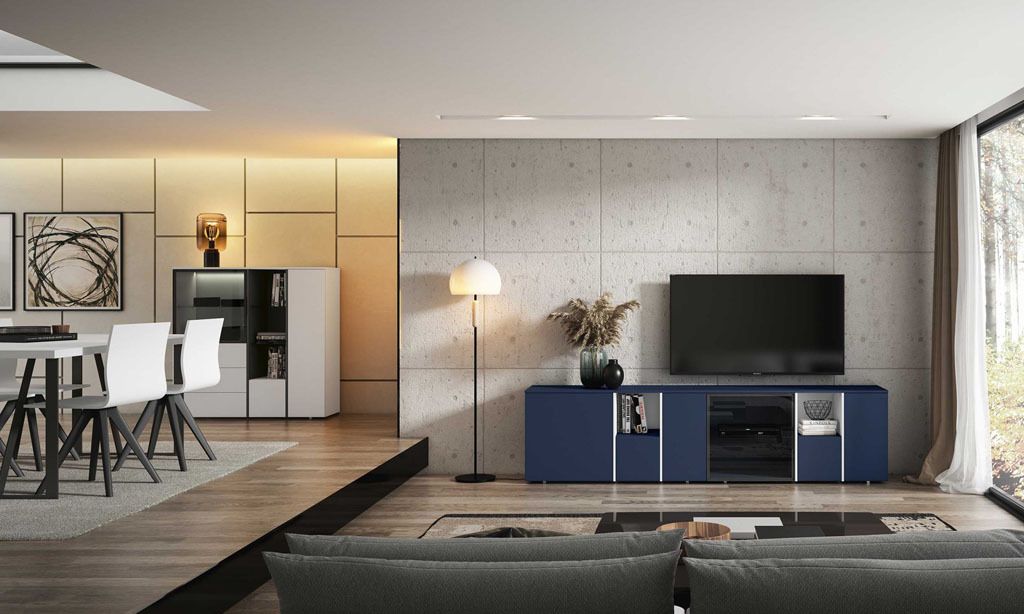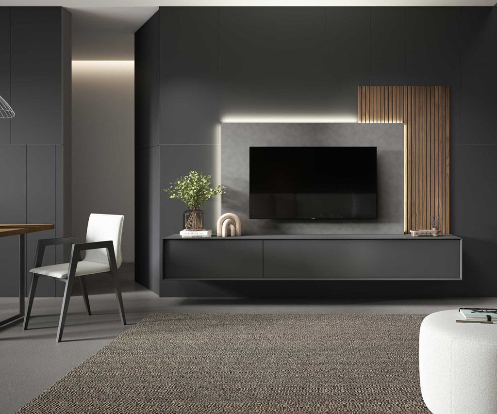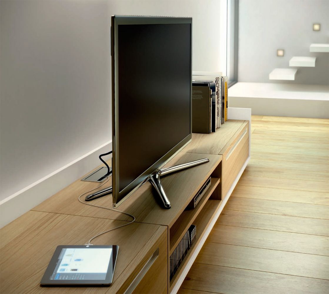 Destaca el encaje del zócalo, tanto en el suelo como en la pared, pues permite tener la pieza perfectamente anclada y solucionar el problema estético del cableado de los equipos electrónicos.